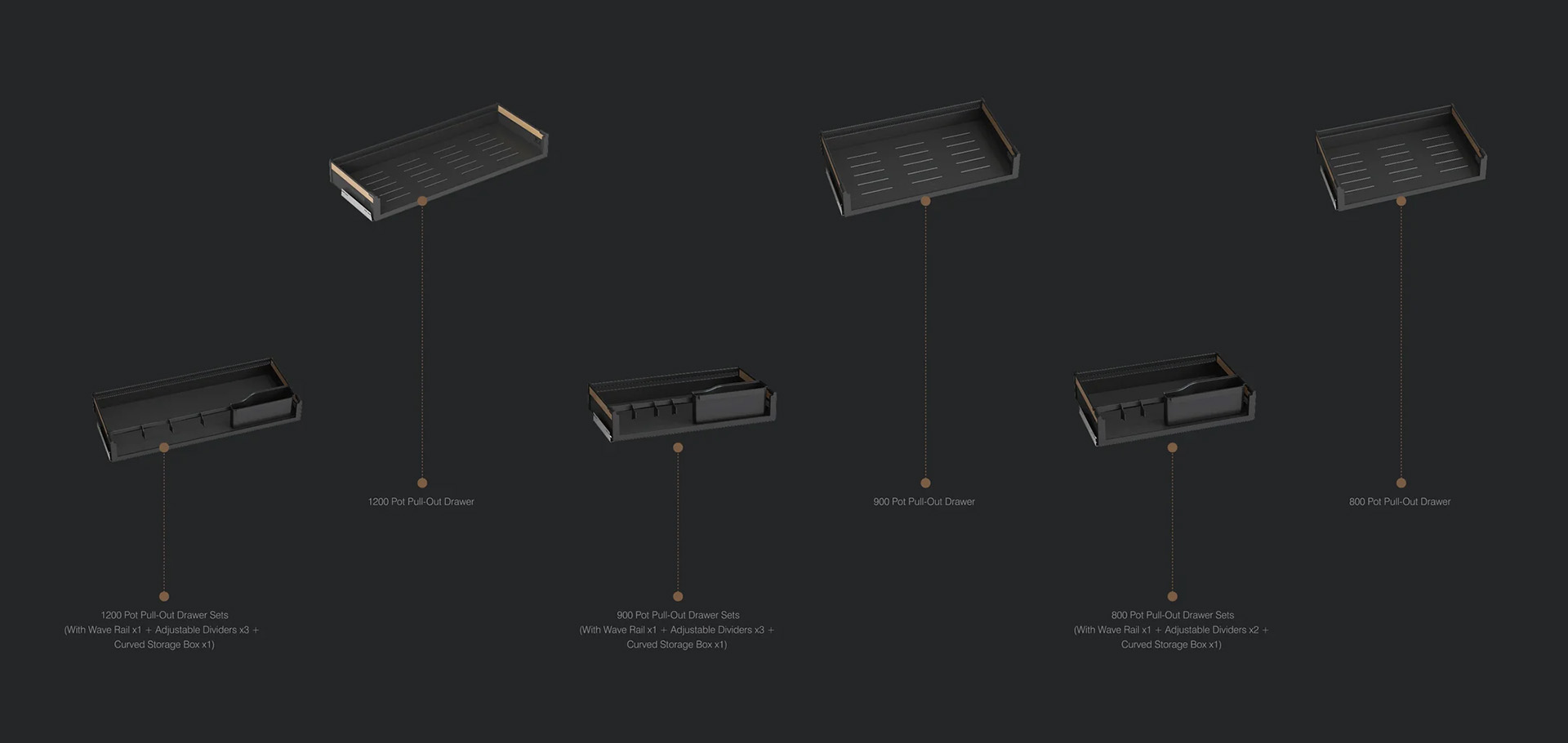 SCHIERS kitchen pull-out system fully absorbs the "cross-boundary inspiration" and integrates the most decorative and functional design elements to present users with a collection of works that combine aesthetics and practicality, elegance and nobility, and simplicity and sophistication - such as theater-style plate racks, portable kitchen utensil boxes that can be moved, and hanging pot and pan storage devices that avoid contaminating the cabinet.